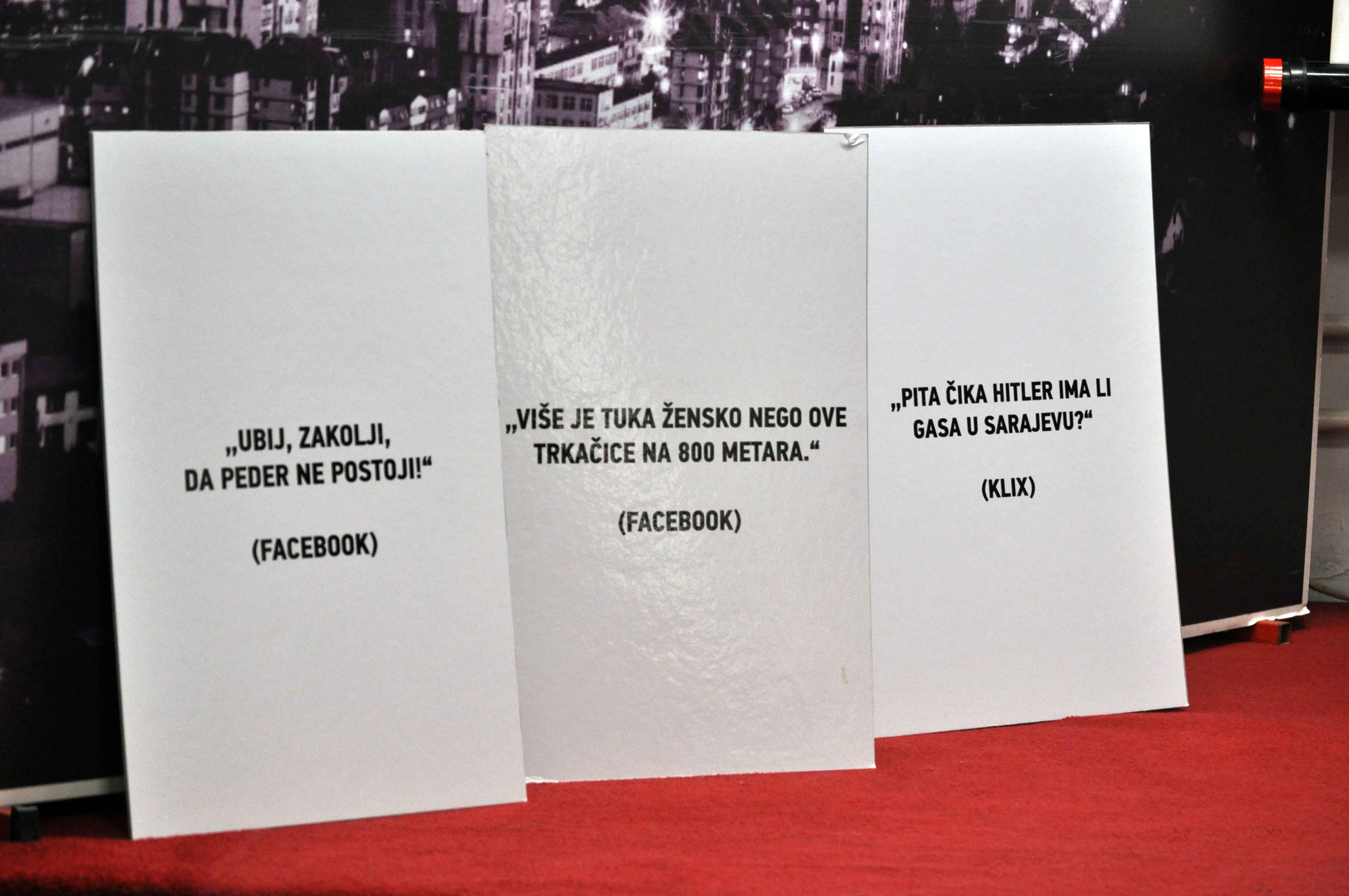 Elvedina Omerhodžić i Faris Šehović koji vode projekat „Galerija uvreda“ su predočili rezultate i primjere iz istraživanja o govoru mržnnje na intermetu, gdje su glavna meta sami većinski narodi u BiH, u zavnosti od nacionalnosti kometatora, ali i manjine, posebno LGBT populacija. Romi, ali i žene, prije svega u seksulanom, mada ćesto i širemu društvenom smisilu. Komentatori koji ostavljajuju ovakve komentare su anonimni, odnosno potpisani sa nadimkom (nickname).